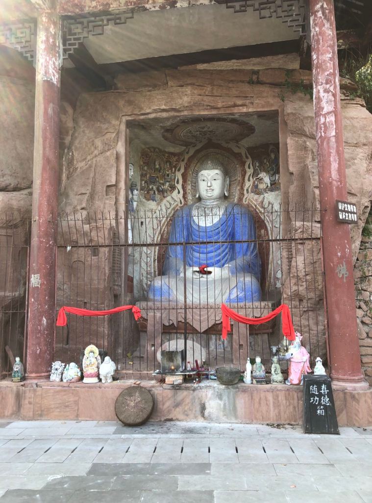 This is the most classic cave in the whole stalagmite Mountain Grottoes. It is the most typical and classic statue in Buddhist statues. This cave is larger and well preserved than the others. Therefore, this section of cave statues is locked in the iron gate. Pilujana Buddha sits on the lotus platform, and Ananda with Kasyapa are standing on both sides of the Buddha. On the right side of the six-tooth white elephant is Puxian (or Samantabhadra, the Bodhisattva of practice and meditation), and on the left is Wenshu (or Manjusri, Bodhisattva of Wisdom). Unfortunately, the head of the Buddha is missing. Next to Vairocana 毗卢遮那佛 Buddha is the Heavenly King Vaisravana 毗沙门天. The other statue is about 4 meters high, wearing armour, stepping on the Yasha, with his right hand on his hips and his left hand supporting the pagoda. This is Li Jing, the “Pagoda-Bearing Heavenly King” in the famous ancient novel “Journey to the West”, which has been changed by the people several times.