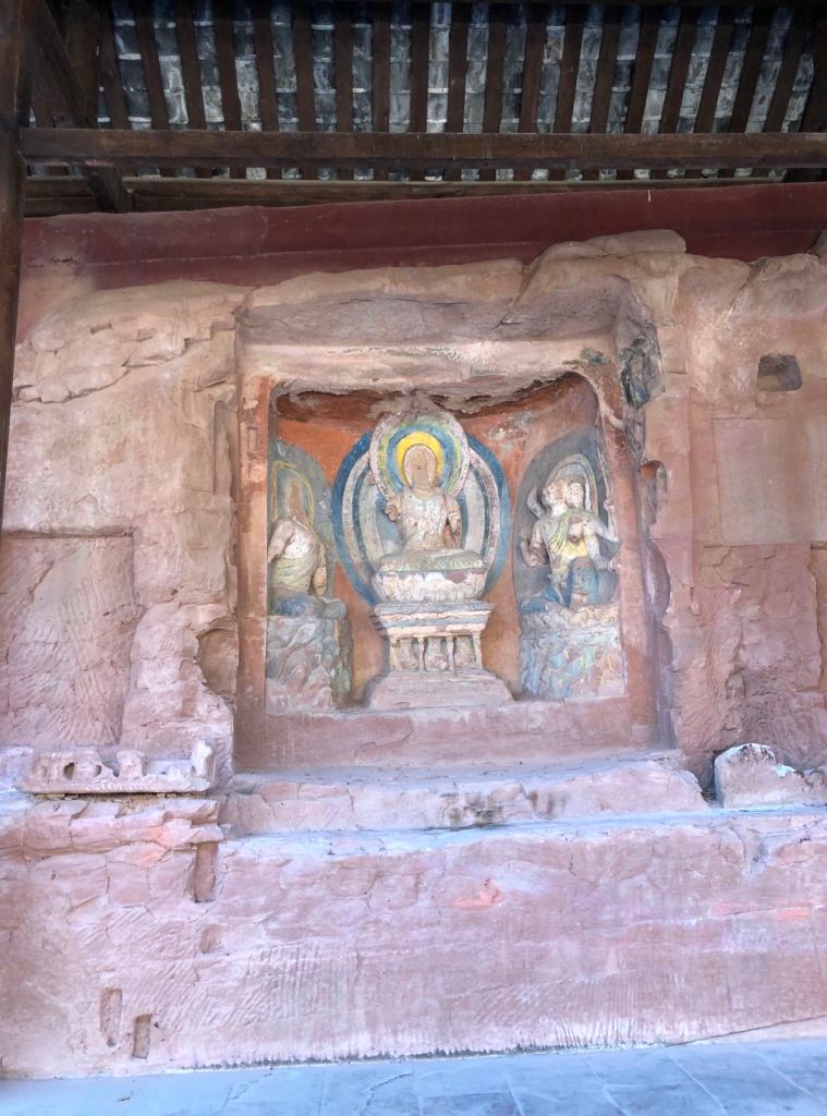 There are murals of the Ming Dynasty (fine brushwork and heavy colour surface) on the four walls of the hall, which is a precious cultural heritage. The content of the murals is a Buddhist story depicting the “fifty-three ginseng of a talented boy”. The stories in the murals are separated by mountains and rivers, trees, flowing clouds, houses and pavilions so that the upper and lower parts are connected and independent of each other. Its strokes are strong and smooth, the colours are gorgeous, the picture structure is strict, and the characters are carefully depicted, which is similar to a precious classical comic strip. There are still four grottoes of cliff statues around the temple. The first cave in front of the temple is the one Buddha and two Bodhisattvas in the 15th year of Yuanhe (820 A.D.). The left and right outer walls are engraved with floating pictures and a group of acrobatic musicians. One of the five Grottoes behind the temple is “Thousand Buddhas”, the other is “pure land change”, and the other grotto is a Tantric statue, also Tang style.