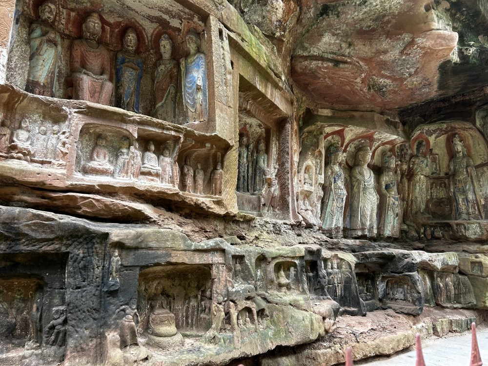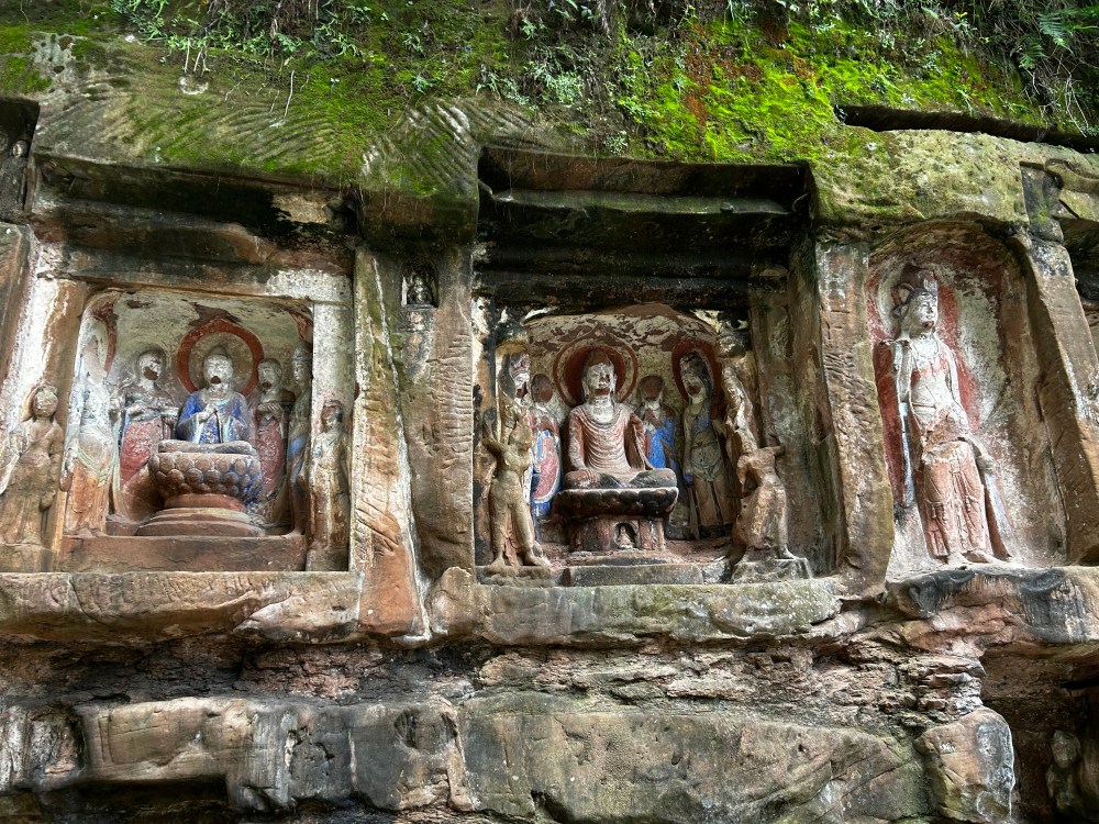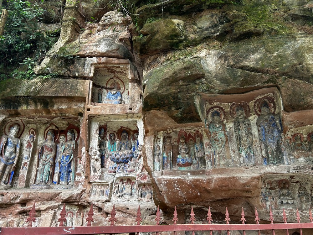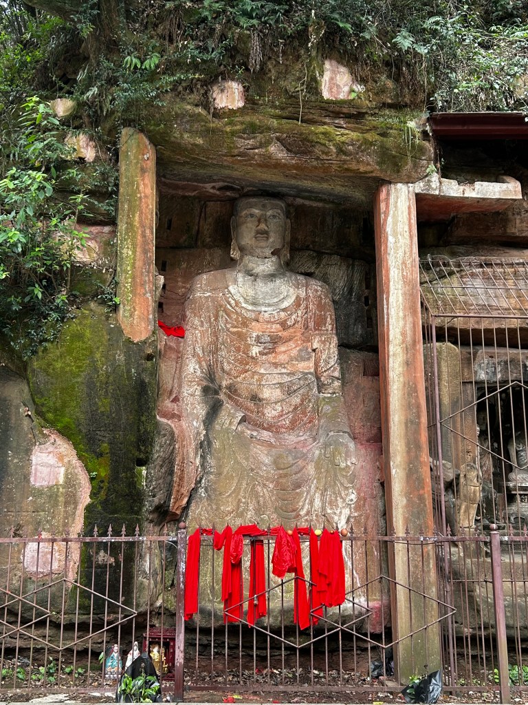 The craft at Feixian Pavilion is breathtaking. Sculpted from acidic red sandstone, the statues endure not only because of ancient engineering—roofs carved into the cliff to shield them from rain—but also thanks to nature itself. Vines and yellow joggle trees have wrapped the cliff in a protective embrace, shielding the sculptures from erosion.